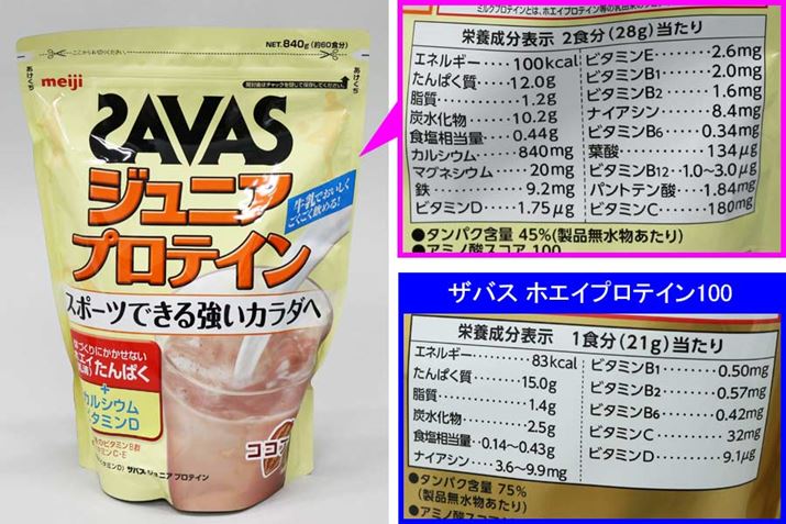 成長期の子どもには、子ども向けに配合されたプロテインをプラスしてもいいかも。ザバスのスタンダードなホエイプロテイン「ザバス ホエイプロテイン100」と比べると、「ザバス ジュニアプロテイン」はカルシウムや鉄、マグネシウムなど成長に必要な成分がいろいろ配合されています