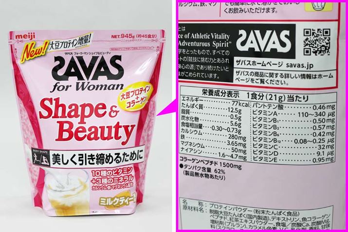 プロテインに含まれるカロリーは少ないものの、運動をしないので、少量のカロリーでも気になるという人はシェイプアップを配慮したプロテインを選ぶのもあり。ソイプロテインの「ザバス for Woman シェイプ&ビューティ」は1食分(21g)でたんぱく質は12.5g摂れるほか、10種類のビタミンと3種類のミネラルを配合しながら、カロリーは77kcalに抑えられています