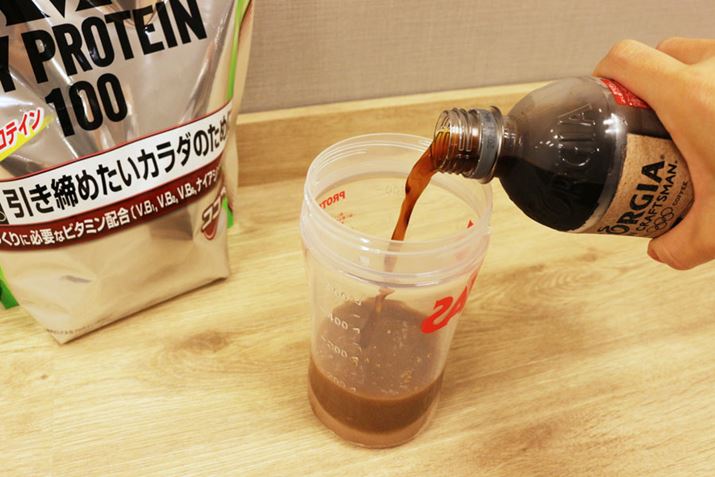 粉末タイプのプロテインは水だけでなく、牛乳や豆乳など、ほかの飲料と混ぜてもOK。水よりもカロリーは高くなりますが、そこまで気にしなくてもいいでしょう。筆者は、ココア風味のプロテインを水とコーヒーでシェイクするのがお気に入り!(カフェモカのような味で、けっこうイケます)