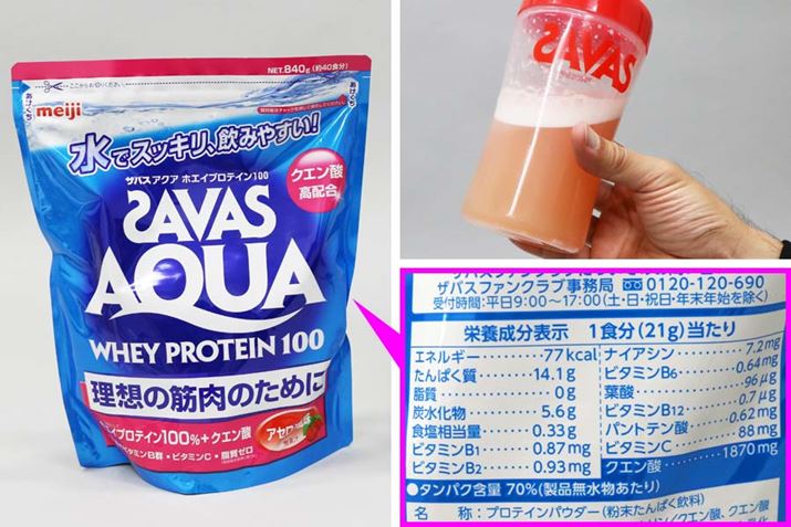 運動直後の飲みやすさを追求したホエイプロテインもあります。「ザバス アクア ホエイプロテイン100」はアクア製法で、すっきりとした飲みやすさを実現。水で溶かす専用のプロテインですが、牛乳っぽいニオイやとろみもなく、まさにジュースのような味と喉ごしでした。クエン酸など7種のビタミンB群、ビタミンCも配合されています。写真のアセロラ風味のほか、グレープフルーツ風味もラインアップ