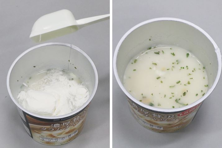 ホエイ特有のニオイや味が抑えられているので、料理に混ぜてももとの食品の味が損なわれません。試しに、ある程度冷めたカップスープに混ぜてみたところ、プロテインを追加する前も後もほぼ味は変わりませんでした。普通の食事では足りないたんぱく質を、このように料理に混ぜて摂るのもいい方法でしょう