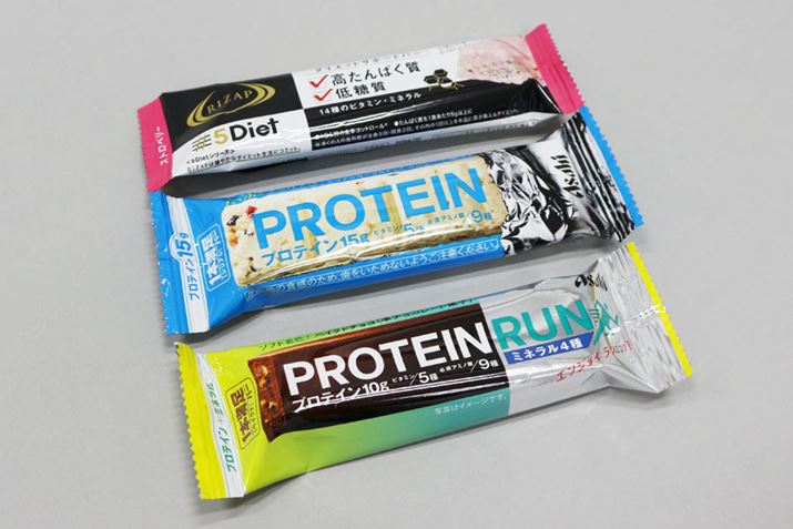 時間がない時や小腹がすいた時には、プロテインバーが便利。いろいろな種類が発売されているので、好きなものを食べてみて! 気になるニオイや味はまったくしないので、普通のお菓子を食べている感覚で10〜15g程度のプロテインを摂取できます