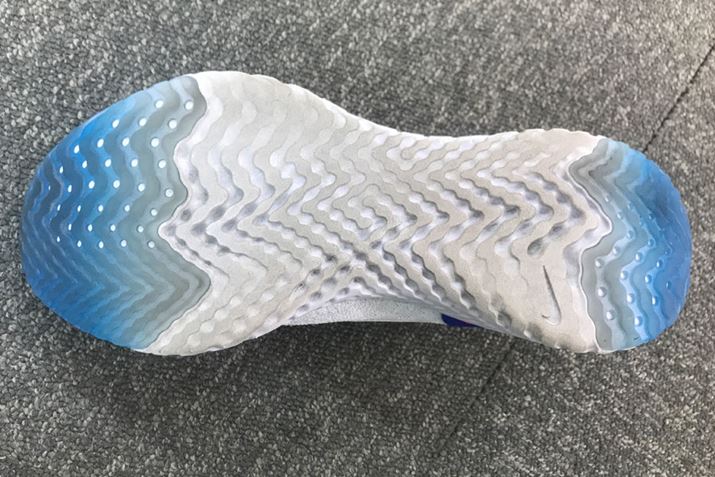 今回、「ナイキ エピック リアクト フライニット」に初搭載されることになった「ナイキ リアクト」は、「衝撃吸収性」「反発性」「軽量性」「耐久性」のすべてを同時に追求したミッドソールテクノロジー。表面には凹凸を配しており、この深いくぼみはやわらかさとクッション性を、浅い部分は硬さと安定性を確保している。ミッドソールはかなり厚いが、「ナイキ ズーム フライ」などと異なり、カーボンナイロンなどのプレートは内蔵されていない。