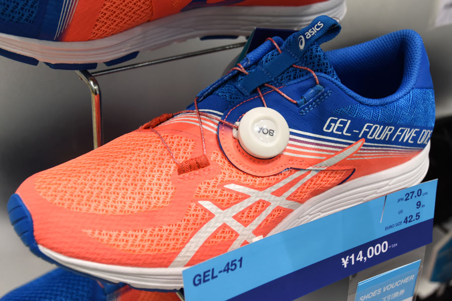 「GEL-451」は、ダイヤルで締める「Boaクロージャーシステム」を搭載したトライアスロン対応レーシングモデル。ダイヤルは耐衝撃性を備え、偶発的な開放が起こりにくい構造を採用する。