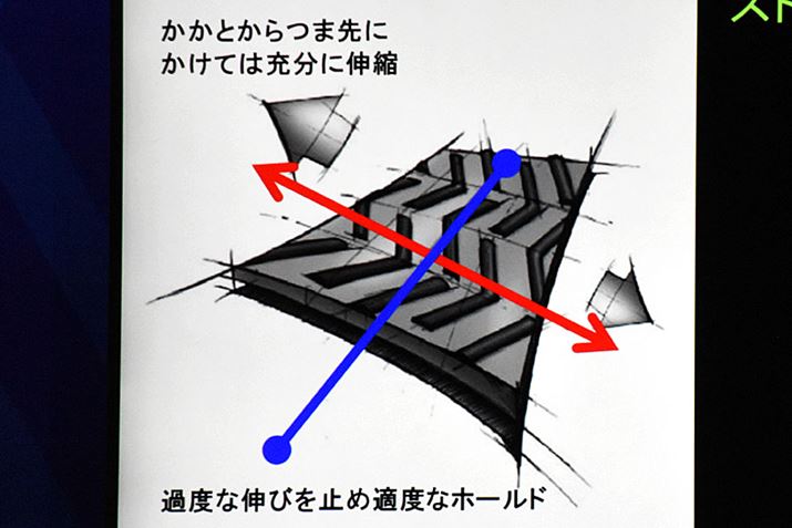 「WAVEKNIT」の凹凸の解説図。かかとからつま先にかけての前後方向にはしっかりと伸縮するため足へのフィット感が高く、親指側から小指側にかけての左右方向には過度に伸びづらく、足を適度にホールドする