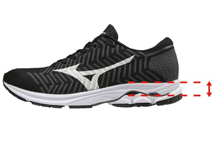 赤い点線のスペースが、かかと部分とつま先部分のソールの厚みの差「ドロップ」。「WAVEKNIT R1」は「ドロップ」が12mmなので、初心者や中級者ランナーに最適といえる