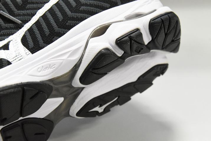 「WAVEKNIT R1」は側面に、ミズノ独自の波形パターンの凹凸を設けたニット素材「WAVEKNIT」(ウエーブニット)を採用。その中の厚みのある部分は、ほかの部分に比べて伸縮性が低いため、ストレッチ性が抑制できる。また、凹凸の形状には波形を採用しており、走行時の足の横ぶれに対してほどよいホールド性を発揮する。