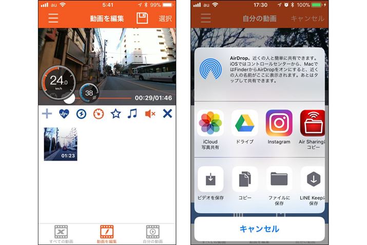 なお、ここで紹介した動画はスマートフォンのアプリ「Xplova Video」(無料)で読み込み、編集したもの。動画と走行データが紐付いているので、速度や心拍数などのデータをグラフィカルに表示し、動画に重ねることも可能だ(非表示にもできる)。また、アプリからYouTubeやSNSにアップすることもできる。