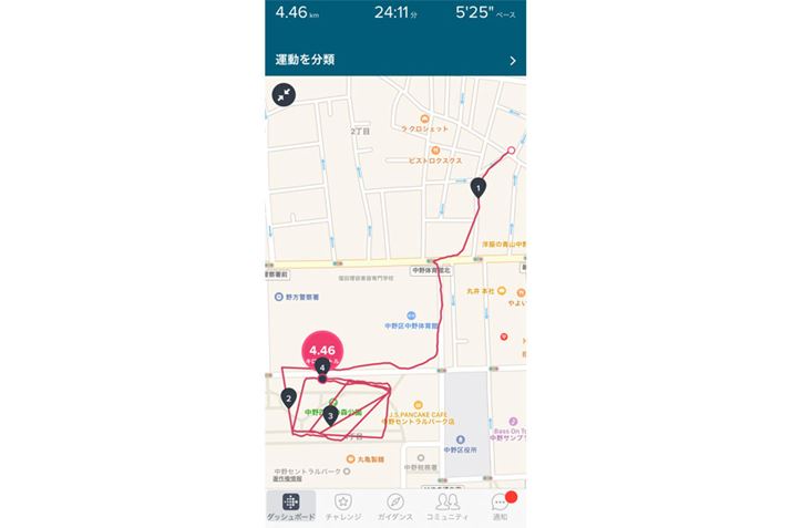 GPS機能により、スマートフォン向けアプリ「Fitbit」に、ランニングで走行したルートをマップにほぼ正確に表示
