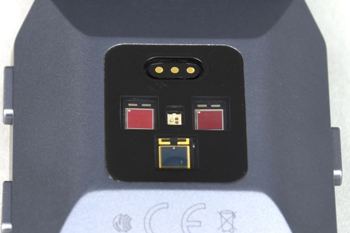 真ん中の小さいセンサーが「PurePulse心拍計」。その左右と下に搭載されているセンサーは、血中酸素濃度を予測する「SpO2センサー」(後述)だ。上部の端子は、充電用