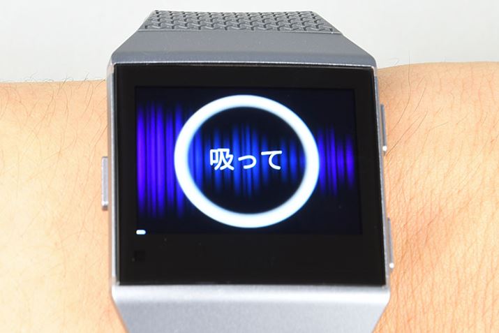 「Fitbit Ionic」のアプリ「リラックス」では、2分間か5分間の呼吸セッションが受けられる。指示通りに呼吸を繰り返すことで、心拍数も下がり、身体をリラックス状態に持っていける