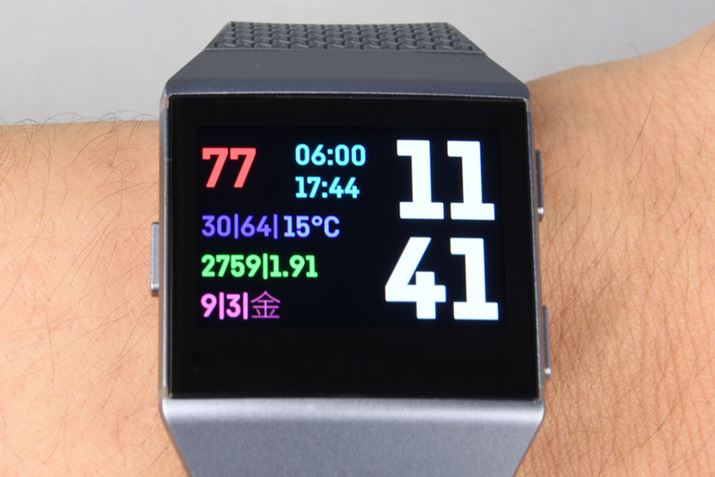 筆者がお気に入りのタイポグラフィーチックなFitbit製クロックフェイス「Stats」。日付、時間、気温、歩数など、項目ごとに色が変えられる