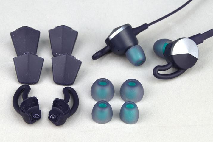 ウィング(左上)、フィン(左下)は各2サイズ、イヤーチップ(右下)は3サイズが付属。自分の耳の大きさや形や、装着感の好みで選べるのがうれしい
