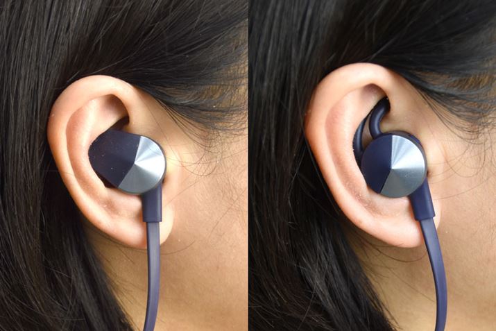 左がウィングを装着したときで、右がフィンを装着したとき。それぞれ引っかける場所が異なる。イヤホン全体の形状が物理的に周囲の雑音を遮断する「パッシブノイズアイソレーション」に対応