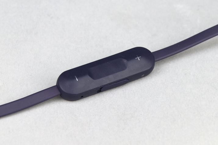 イヤホンのR側下に搭載されたリモコン。3 つのコントロールボタン(真ん中/+/−)で、音楽再生時のボリューム調節と再生の一時停止、曲の変更が可能。また、デュアルマイクを搭載しており、ハンズフリーで通話の応答と終了も操作できる