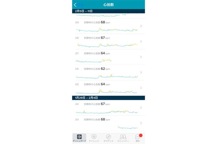 心拍数の1週間の計測結果。フル充電の状態で2月3日の夕方から計測を始め、2月7日正午過ぎに取り外して充電している。心拍数を1日中測っていても丸4日間バッテリーが持ったことになる