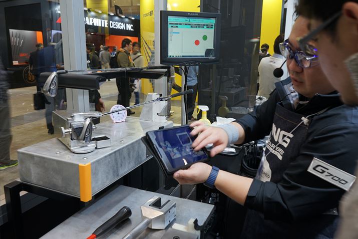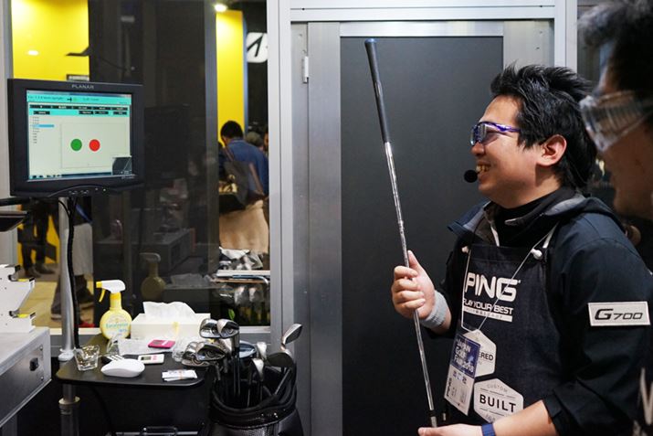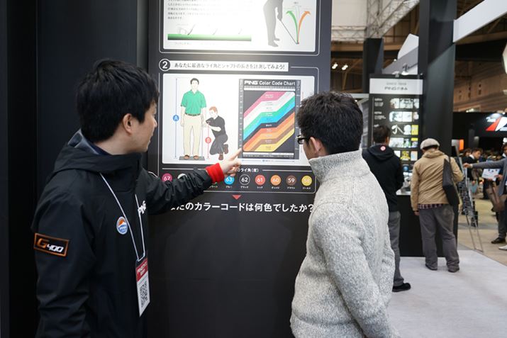 ピンはクラブフィッティングを昔からずっと提唱しており、現在は「革新的製品開発力」「カスタムフィット」「最高品質国内組み立て」を3本の柱としているメーカーです。体型の異なる人が、長さや角度が同じクラブを使っていいはずがないというのが創業者の考え方。つまり、クラブを使う人に合わせることを基本としています。さらに、すぐれたものをその人に合った形で正確に作るという、ユーザーにとってはとてもありがたい思考です。今年のJGFのブースではこの考え方に基づいた体験展示をされていたのでのぞいてきました。