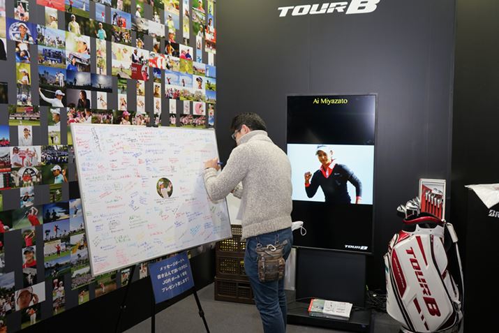 女子プロつながりで、ブリヂストンのブースにある宮里藍さんコーナーで、寄せ書きをしてきました。藍さんは競技生活から引退されましたが、今の日本女子プロゴルフ界の立役者の1人。日本人初の世界ランク1位のゴルファーであり、その人柄が世界中のゴルファーに愛された方です。藍さんを見てゴルフを始めたゴルファーはたくさんいるはず! お疲れ様でした〜と書かせていただきました。
