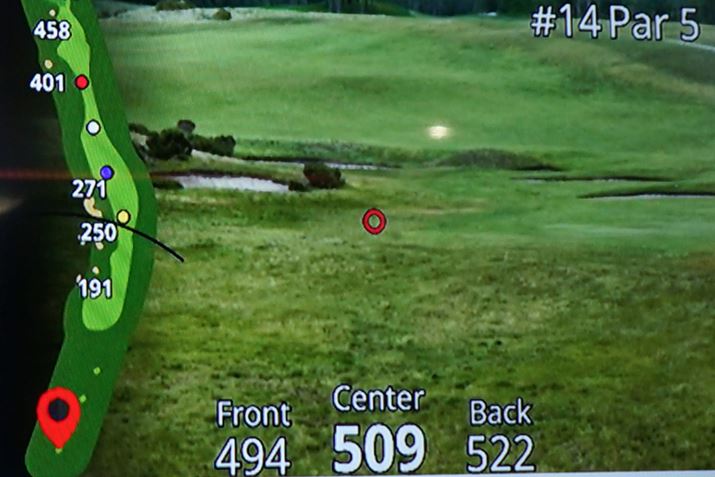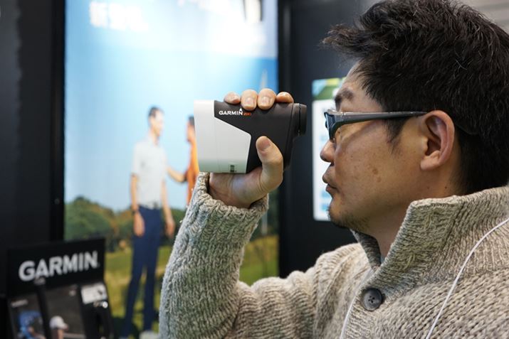 1つ目はGPS付きレーザー距離計の「Approach Z80」。以前ここのコラムでも取り上げたレーザー式距離計とGPS式距離計が1つになったモデルです。ファインダーをのぞくと、望遠された景色の左側にGPS式同様の「ホール俯瞰図」が映し出されるというもの。しかもレーザー式で測った距離がホール俯瞰図にも円として表示されるので、自分が今どの辺を見ていてその周りに何があるのかが確認できる、今までにないアイテムです。初めて回るコースでこれがあったらすごい便利でしょうね〜!