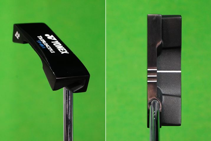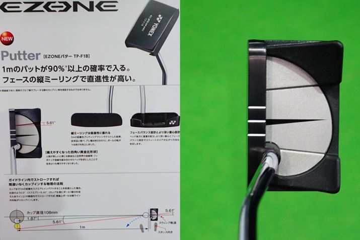 最後に、ヨネックスのおもしろいパターをご紹介して終わります。これはヨネックスのトライプリンシプルシリーズのパターです。同シリーズは、物理の法則と人間工学に基づいて設計されているパター。最新のモデルが発売されたのですが、前から気になっているのは1つ前の「TP-BR1」というモデル。なぜ気になっているかというと、36インチというやや長めの設定に68度というパターにしてはフラットなライ角設定により、普通のショットと同じようにアドレスでき、パッティングをショットのように打てるパターだから。パターに悩んだときのために1本欲しいなってずっと思っているんです…。