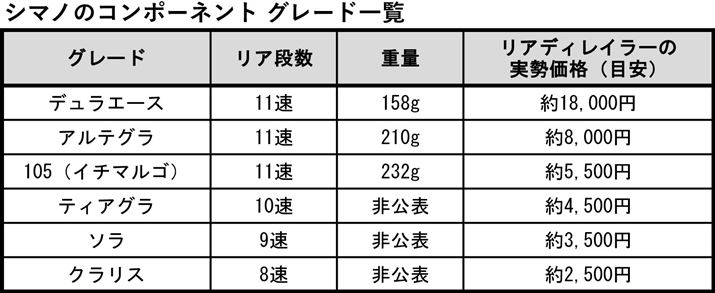 なお、この特集で紹介するロードバイクのフレームは、ほとんどがアルミ製。今はカーボン素材が全盛の時代なので、アルミ素材は1世代前の素材だが、ここ数年、各社がアルミフレームの開発に力を入れており、アルミの加工技術も進化しているため、アルミフレームでも乗り心地がよいモデルは増えている。ただし、変速のギア段数はトップモデルに比べると少ない。たとえば、シマノ製のコンポーネントの場合、最高グレードの「デュラエース」ではリア11段だが、10万円クラスに採用されていることの多い「ソラ」は9段。リアディレイラー単体の価格もデュラエースのリア変速機が約18,000円なのに対し、ソラは約3,500円と大きく差がある。段数の違いだけではなく、レバーを操作した時の軽さ、スムーズさ、耐久性にもかなり違いはあるが、本格的なレースに出場する予定がないなら10万円前後のモデルでも十分だろう。