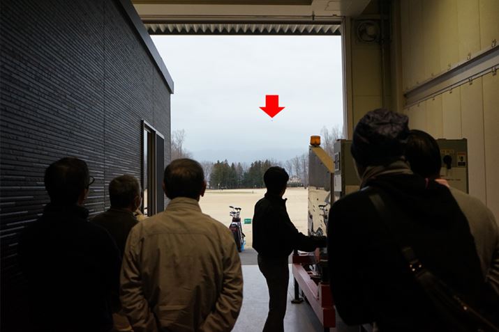 赤い矢印の先が飛んでいくボール。マシンを使ってスピン量を変えると弾道や飛距離に大きく差が出るのを見て、皆さんびっくりされておりました