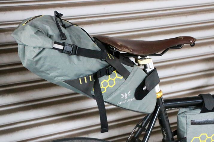 高い位置に取り付けるため、あまり重いものを収納すると不安定になるので、大きいけれども軽いものを入れましょう。写真のサドルバッグは、「Apidura(アピドゥラ) サドルバッグ コンパクト」(容量11L)