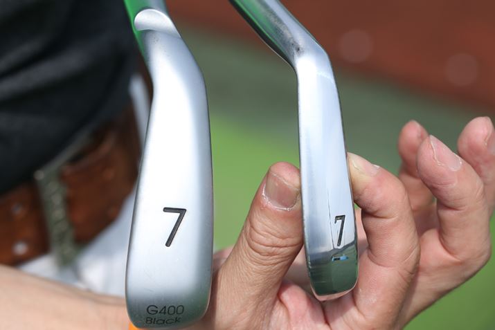 上がバランス系アイアン、下がMB。操作性を重視するMBは重心距離が短く設定されており、そのためヘッドのサイズはみな小さめ。肉厚なためヘッドを重く大きくできない側面もありますが、大きくする必要もないため問題にはなりません
