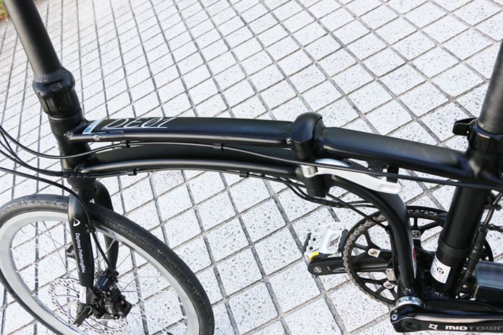 一般的な自転車のフレームは主に真円形状だが、DE01シリーズは扁平加工した2本のパイプを重なるように配置。フレームの剛性を高める工夫が、見た目のインパクトにもつながっている