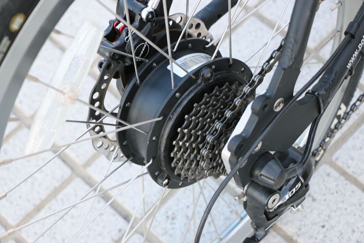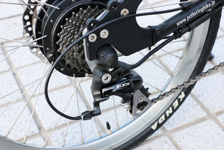 モーターはシティサイクルタイプの電動アシスト自転車によくある左右ペダルの軸(クランク)部分に搭載するタイプではなく、リアホイールのハブ部分に装備している。これもDE01シリーズ共通の仕様