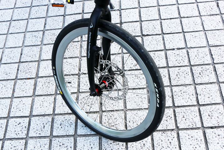 DE01Xのホイルとタイヤも他2モデルと同じ20径だが、小径車の中でもスポーツ性の高いモデルに搭載されることが多い「451」規格を採用。リムも空気抵抗を低減し、速度を維持しやすいように高さのあるものが装備されている