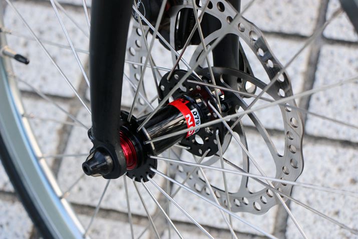 フロントホイールのハブにも回転効率のよいものを採用。これだけで1万円程度はするパーツだが、速度を維持するためには有効な装備だ