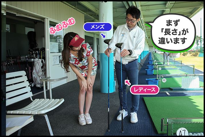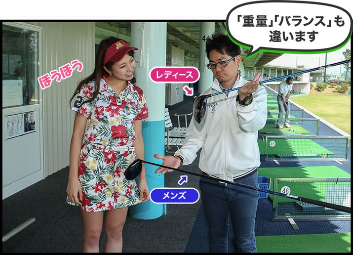 オグ:レディースモデルのほうが短く設計されています。短い分だけ、ボールに当てやすくなるということもありますが、一番のメリットは振るときの抵抗が少なくて済むことなんです。