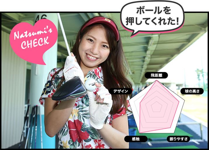 なつみ:レディースモデルはピンクが多いんですけど、これは明るいブルーでかわいいですね! 珍しいと思います。打ってみたら、結構左に飛んでいくボールが多かったかな。ときたまインパクトの瞬間に重い感触があるんですけど、それが気持ちよかったです。
