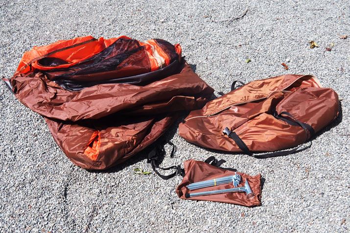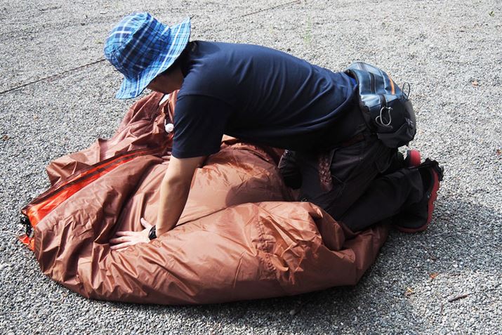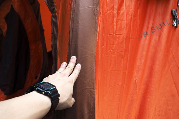 20秒ほどでテントはペシャンコになりますが、空気は完全には抜ききらないので、最後の仕上げは手動。たたみながら体重をかけ、空気をしっかり抜きましょう