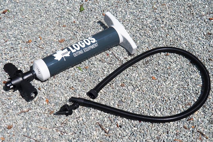一般的なテントの付属品と違い、空気を入れるためのポンプが同梱。写真ではポンプとホースが外れていますが、使用時には接続します