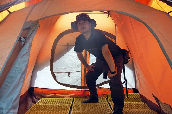 テントの高さは155cmなので、身長165cmの筆者もテント内で直立することはできませんでした。高さを低めにすることで、風の影響を軽減しているのだそう