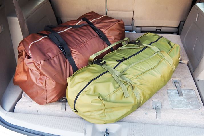 左側が付属のバッグに納めたM-AH。ペグやハンマー、空気を入れるポンプもバッグに入っています。収納サイズは66(幅)×26(奥行)×26(高さ)cmで、筆者所有の大人5人が過ごせるテント(モンベル「ムーンライトテント7型」)よりも大きめ。重量も7.2kgと筆者所有の5人用(7.8kg)と変わらないので、収容人数のわりに収納サイズと重量は大きめです