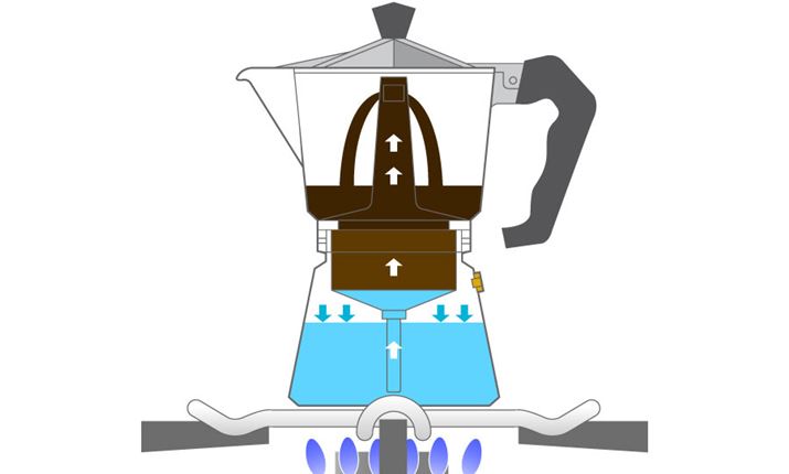 マキネッタでエスプレッソを淹れる仕組みを図解すると、このようになります。本体内の圧力変化を利用し、お湯を一気にコーヒー粉に通して抽出