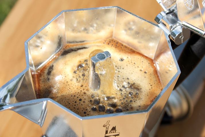マキネッタからコポコポと音がし始めたら抽出終了。アウトドアでは風などの影響で時間は前後しますが、3〜5分で抽出は完了します。なお、エスプレッソの1カップ分とは、小さなデミタスカップ1杯分のこと