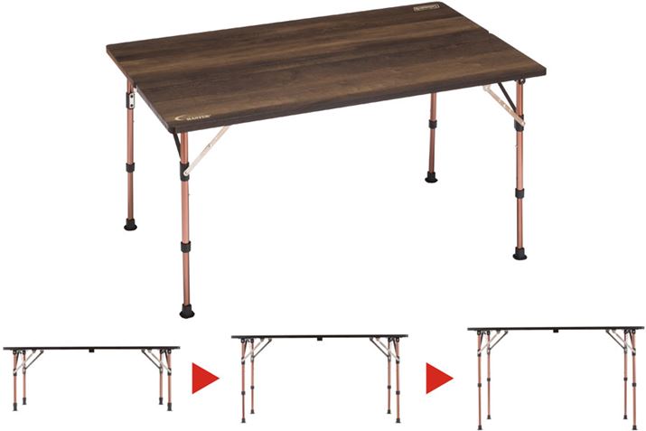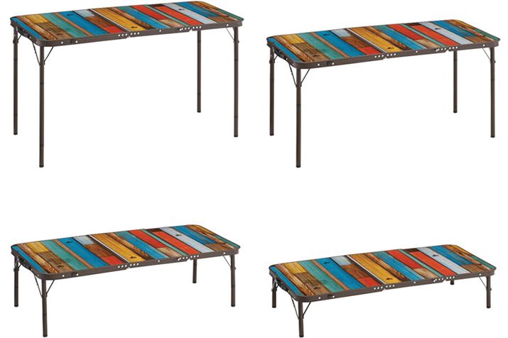 4段階に高さ調節ができる3つ折り式のテーブルで、厚さ約5cmに収納可能。水に強いフェノール樹脂天板とステンレスリベット、アルミパーツを使用しているので、さびにも強く、丸洗いもできます。