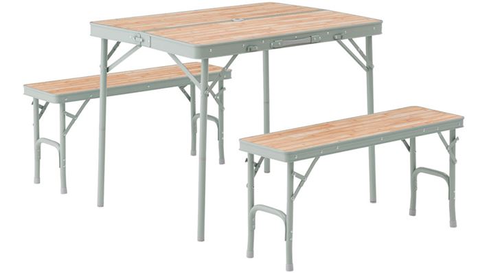 使用時のサイズはテーブルが約90(幅)×65(奥行)×70/40(高さ)cmで、ベンチが約87(幅)×25(奥行)×40(高さ)cm。収納サイズは約94.5(幅)×35.5(奥行)×11.5(高さ)cmで、重量は約8.3kg