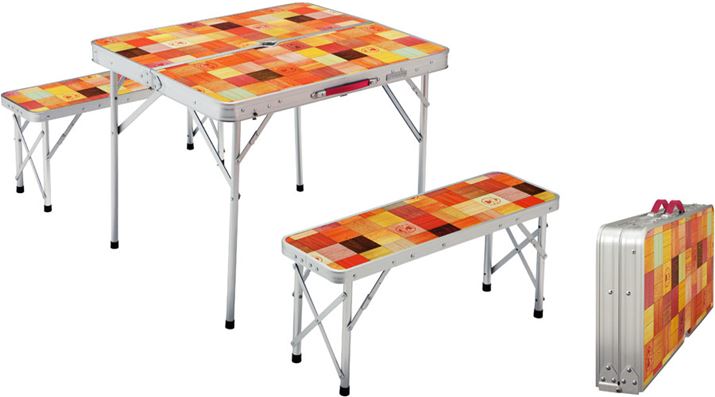 キャンプサイトに彩りを添えてくれるモザイク柄が特徴のファニチャー。天面は水濡れに強いメラミン加工が施されているほか、抗菌加工で衛生にも配慮されています。テーブル中央にパラソル穴もあり。