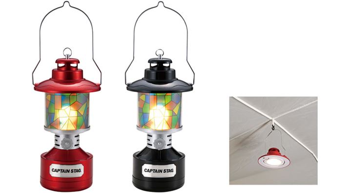 ステンドグラス風のシートが付属しており、クラシカルなやさしい暖かみのある灯りを演出。傘と本体は分離でき、それぞれが点灯するようになっているので、傘はテントの天井に吊り下げ、本体はキャンドルのようにテーブルでと、同時に使うこともできます。