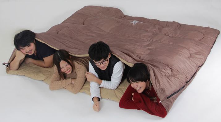 大人4人が一緒に入れてしまうほどの特大サイズでありながら、1分以内で収納できる独自構造を採用。2つのシュラフに分割することもでき、そのサイズは2人用と大きいので2人ずつに分かれて寝ることもできます。もちろん、洗濯機で丸洗いOK。