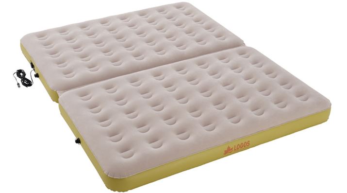 圧倒的な快適さを望むなら、厚さ約22cmのエアベッドが最高! ベルベット仕上げなので、肌触りもバツグンです。空気は自動車のシガーソケットを使って電動で注入するので、苦労はしません。電源コードが約10mと長いので、少々自動車と離れた場所で広げても問題ないでしょう。