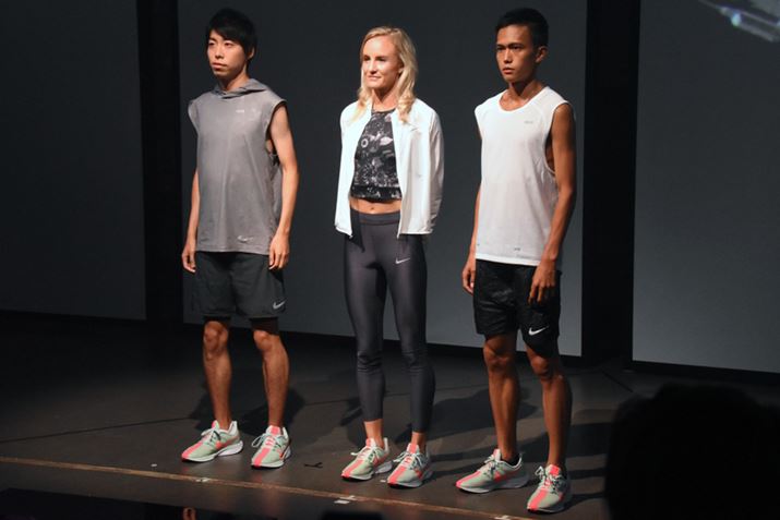 「ナイキ ズーム ペガサス ターボ」の発表会のワンシーン。左から、設楽悠太選手、オリンピック4回出場のアメリカ人メダリスト、シャレーン・フラナガン選手、「ナイキ オレゴン プロジェクト」所属の大迫傑選手。フラナガン選手は、テンポよく気持ちよく走れる「ナイキ ズーム ペガサス ターボ」を、「(練習の中の)デザートシューズ」と表現する