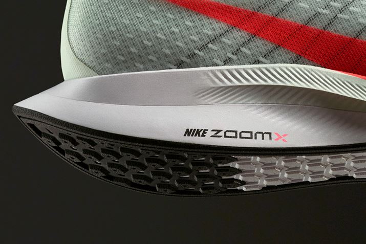 「ナイキ ズームX」の最大の特徴は、エネルギーリターンの高さ。エネルギーリターンとは反発性のことで、簡単に言えば、踏み込んだ足が地面から離れるときに素材が元の形に戻ろうと跳ね返って、足にエネルギーを還元させる割合だ。通常のランニングシューズのミッドソール素材だと、エネルギーリターンは60%ぐらいで残りの40%は損失してしまう。いっぽうで、「ナイキ ズームX」のエネルギーリターンは、驚異の85%。走行時の推進力は抜群と言えるだろう。