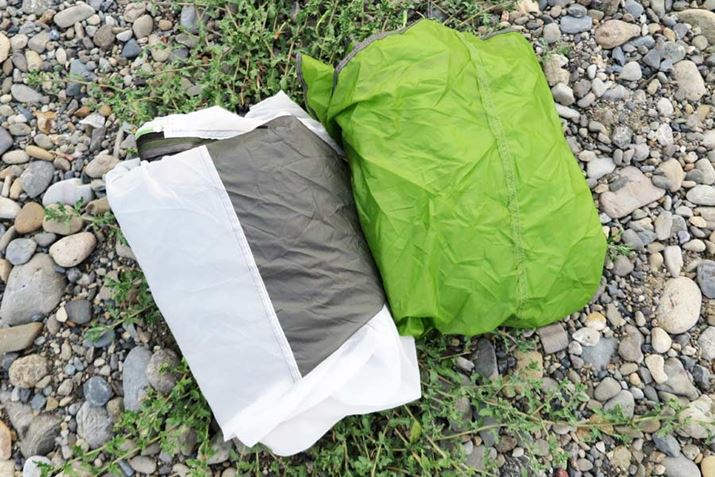 左がインナーテントで、右がフライシート。インナーテントはナイロン、フライシートはシルナイロンという素材の違いはあるが、どちらも15デニールという極薄の生地を使用している。ちなみに、これらを収納するスタッフバッグは防水性で、雨に濡れたテントを入れても水分が外部に流出しない