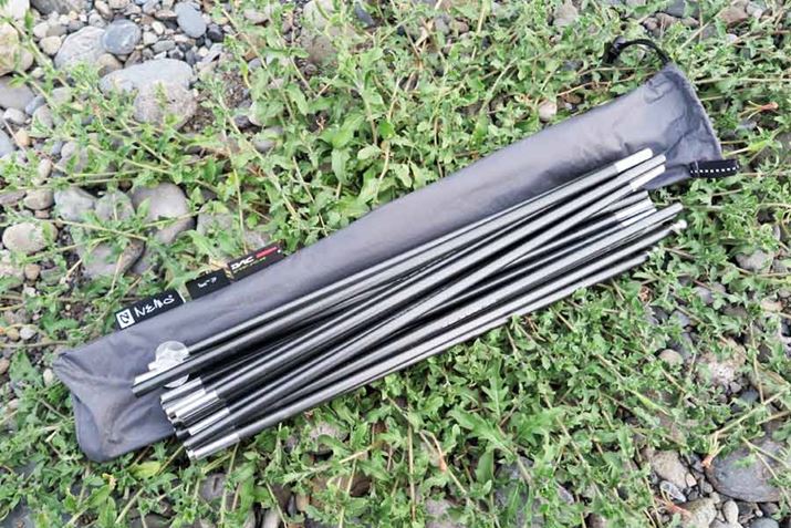 ハブで連結されたポールは、同じ長さのものが2本。素材は軽量なDACで、設営時はバネのようにしなやかに曲がる